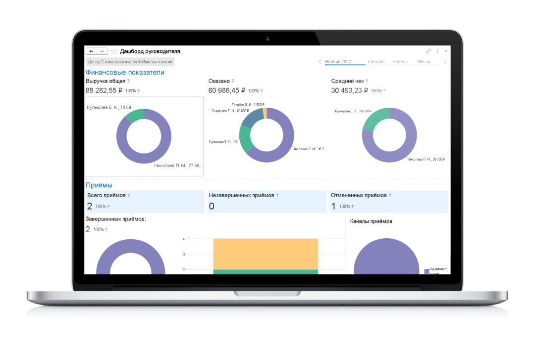 • Анализ эффективности работы по сотрудникам и популярности врачей