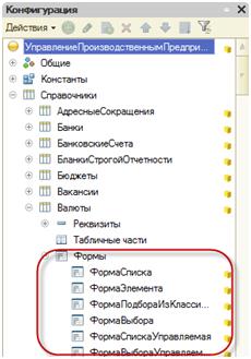 Чтобы пользователю было удобно работать с системой, легко просматривать и изменять данные в документах, программа имеет несколько форм для одного и того же документа. 1С умеет генерировать все необходимые для документа формы. Разработчикам предоставляется возможность конфигурировать самостоятельно формы для документов, которые им необходимы. Увидеть все формы документа можно в конфигураторе системы. Для этого нужно зайти в него и в окне конфигурации выбрать интересующий объект. В раскрытой ветке документа будут отображены все формы документа.