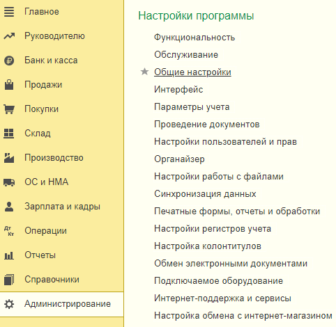 Для удобства работы в 1С пользователь может в любой документ добавлять дополнительные сведения. Для того чтобы сохранить порядок в документации, функциями добавления дополнительных сведений обладает только ограниченный круг пользователей с полными правами в системе. Как добавляются дополнительные сведения рассмотрим на примере документа «Заказ поставщику». Для этого сначала заполним настройки и далее заходим в пункт меню «Администрирование-Общие настройки».
