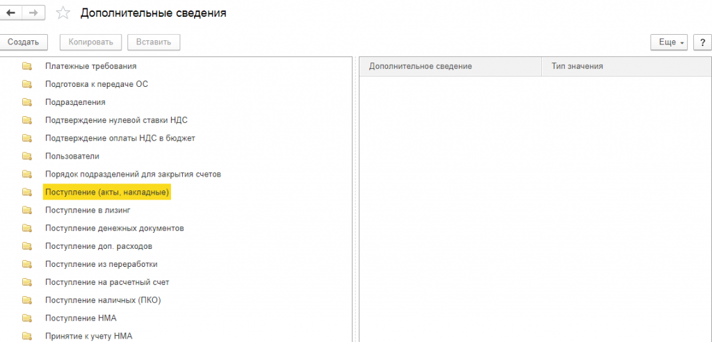 В списке документов, открывшемся перед нами, мы можем задать дополнительные сведения. Например, для документа «Поступление (акты, накладные)» мы решили ввести дополнительные пункты. Находим нужный документ, выделяем его и кликаем на кнопку «Создать».
