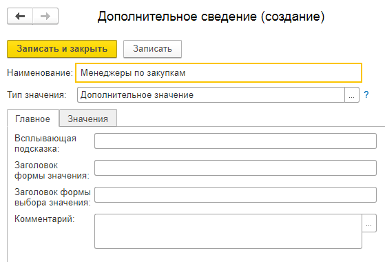 Откроется таблица, где создаются дополнительные сведения. Заполняем всё как необходимо. Укажем наименование дополнительного сведения и его тип значения. Тип значения для удобства может содержать различные варианты: договор, число, валюта, дата, договор и т. д.