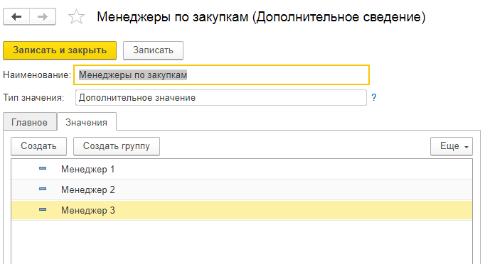 Жмем «Записать и закрыть». С этого момента в документах типа «Поступление (акты, накладные)» появляется возможность присоединить менеджера по закупкам, который занимается этим заказ.