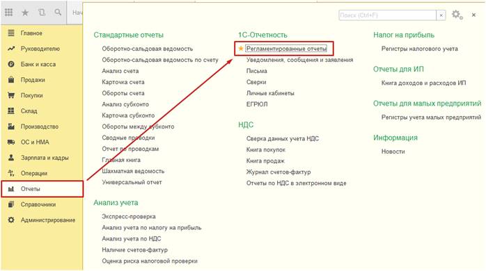 Для начала нужно рассмотреть как сдавать отчетность через 1C. В пример возьмем декларацию по НДС. Для начала, в главном меню нужно выбрать "Отчеты". После чего перейти на "Регламентированные отчеты".