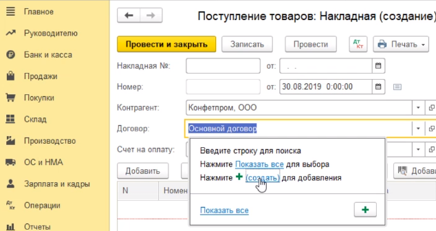Выбираем контрагента, в нашем случае ООО "Конфетпром".