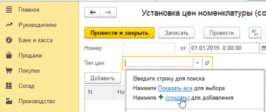 Далее необходимо выбрать тип цен. Если его не имеется, то ее нужно создать. Нажимаем кнопку создать.