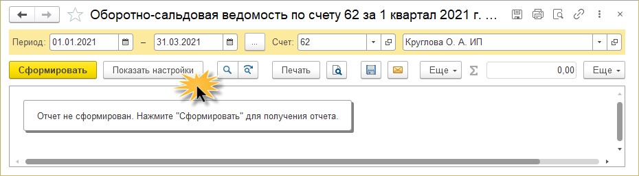 Вернемся к «Оборотно-сальдовой ведомости по счету», который находится в разделе «Отчеты».