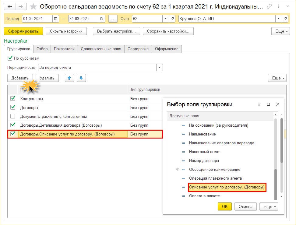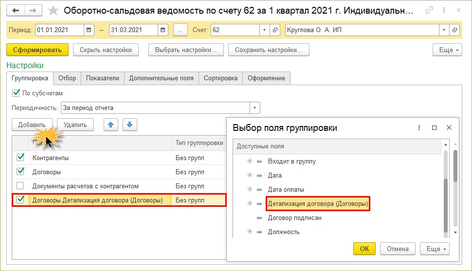 - Во вкладке «Группировка» выберете опцию «Добавить» и найдите поле для группировки «Договоры» (Детализация договора). Это и есть наш созданный реквизит.