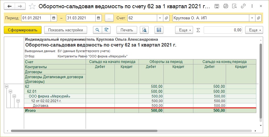 Выберите опцию «Сформировать». Обороты в разрезе договора, а также появление дополнительного реквизита отразятся в отчете выделенной строкой. В созданном нами примере, к договору прикреплена номенклатура «Доставка».