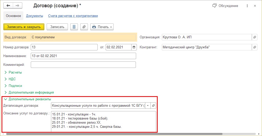 Приведем наглядный пример: ИП специализируется на предоставлении двух видов услуг: «Услуга №1» и «Услуга №2». После зачисления оплаты, согласно договорам, хотелось бы определить неоплаченную услугу, предоставленную контрагентом, в разрезе договоров. В процессе заполнения сведений по договору, в нем отображается только дата и номер. В случае изменения названия договора, это появится и в печатном виде, что не очень функционально. Лучшим вариантом выхода из данной ситуации станет присоединение к договору дополнительных реквизитов.