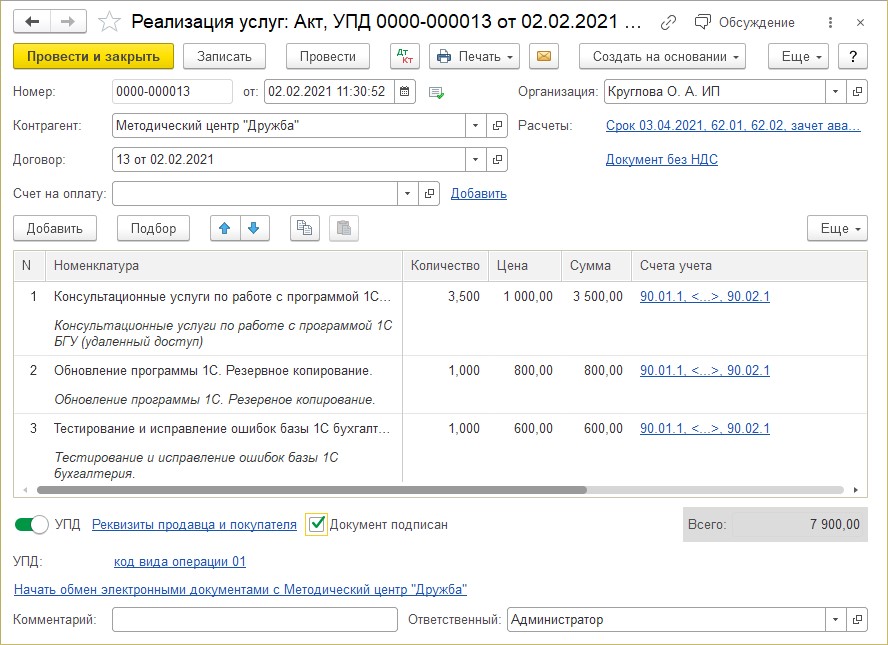 - Произведем реализацию услуги контрагенту и сделаем новый договор.
