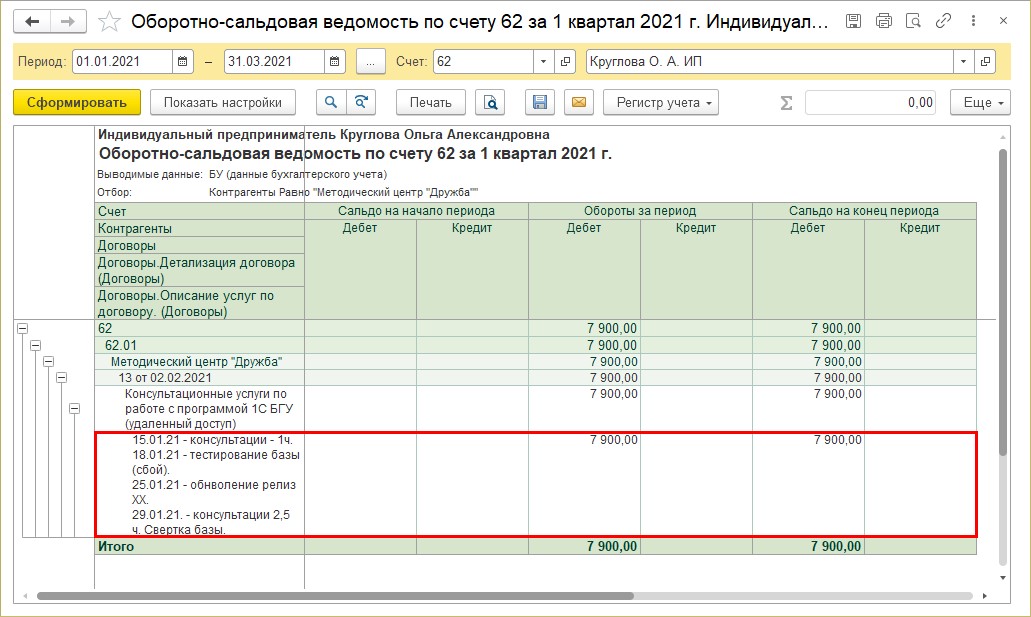 В качестве примера параметр отбора установлен по контрагенту «Методический центр Дружба».