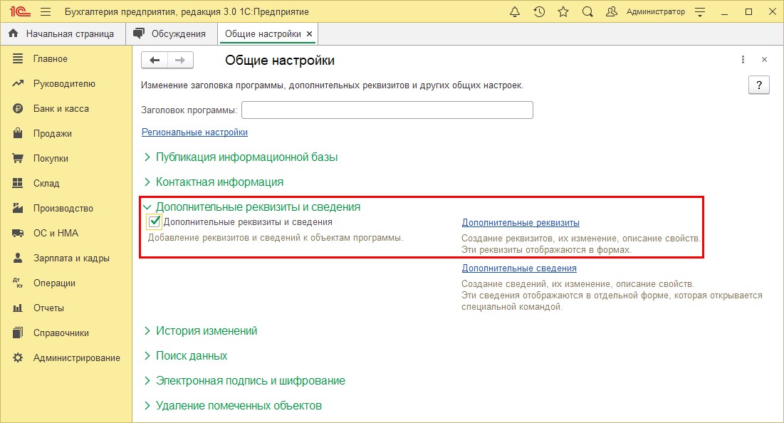 - Необходимо зайти в настройки «Дополнительные реквизиты», которые находятся в «Общих настройках» раздела «Администрирование».