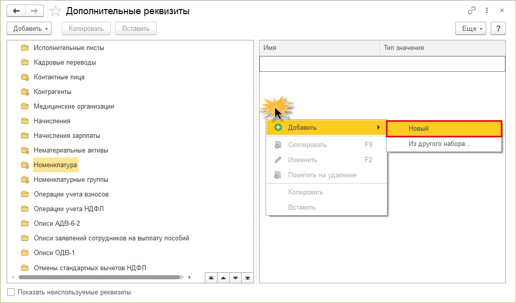 Также для создания нового реквизита можно щелкнуть в пустой графе с правой стороны при помощи правой клавиши мышки. Для этого выберете опцию «Добавить» - «Новый» в контекстном меню.