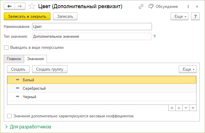 Зайдите во вкладку «Значения» и отметьте возможные значения по реквизиту «Цвет». В будущем справочник можно дополнять.