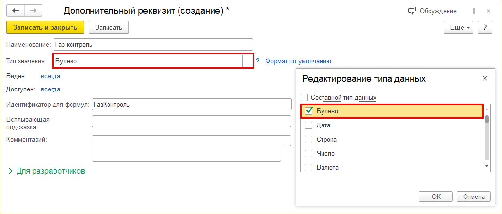 - Задайте наименование реквизита и «Тип значения» в «Булево».