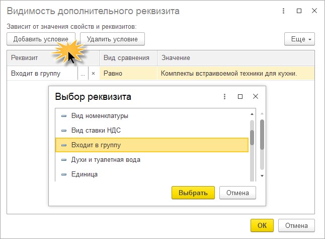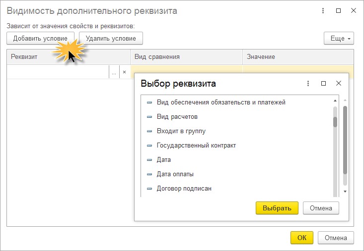 В процессе выполнения настроек видимости, а также доступности, можно задать условия по отображению реквизита, нажав на кнопку «Добавить условие».