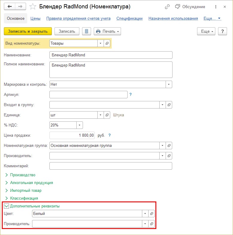 Таким образом, мы добавили 3 дополнительных реквизита для номенклатуры.