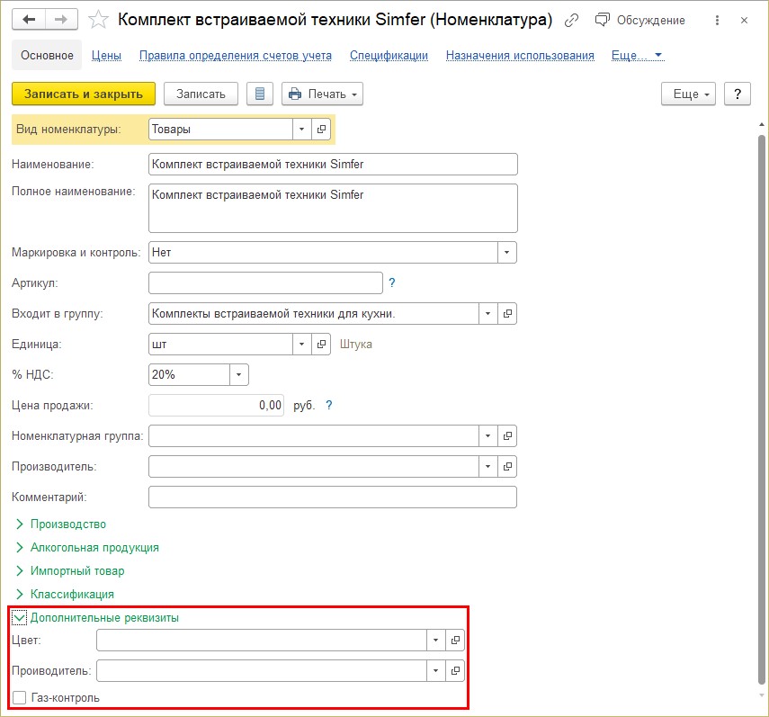 Для номенклатуры, которая находится в группе по заданному условию «Комплект встраиваемой техники Simfer», в карточке дополнительно отображается реквизит под названием «Газ-контроль».