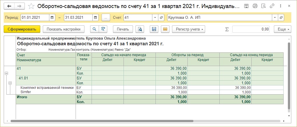 - Создайте «Оборотно-сальдовую ведомость по счету» - 41 «Товары». Меню настроек отчета во вкладке «Отбор» дополните условием отбора «Газ-контроль (Номенклатура)» - Равно. Затем выберете необходимое значение.