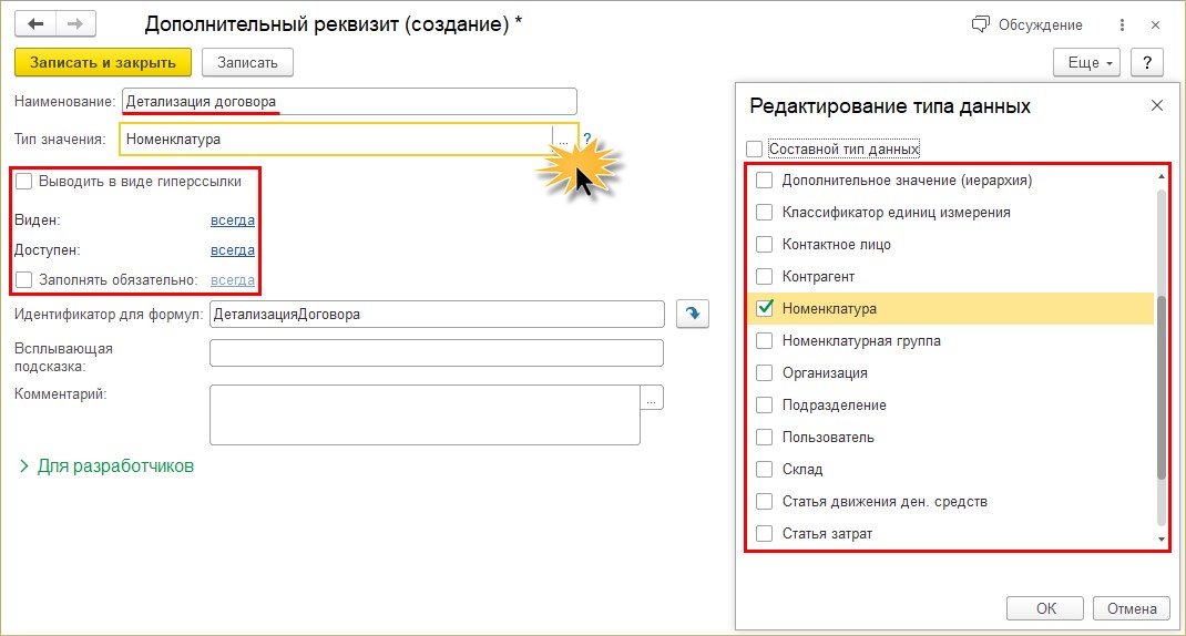На нашем примере следует выбрать «Тип значения» – «Номенклатура».