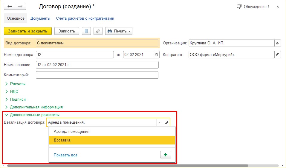 Внимание: Раздел «Дополнительные реквизиты» содержит присоединенный нами реквизит, имеющий наименование «Детализация договора» и предлагающий выбор из справочника номенклатуры.