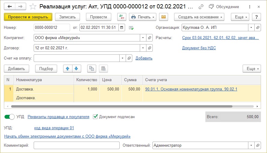 Контрагент ООО компания «Меркурий» получил услугу по доставке. Номенклатура «Доставка» была присоединена к договору №12 от 02.02.2021.