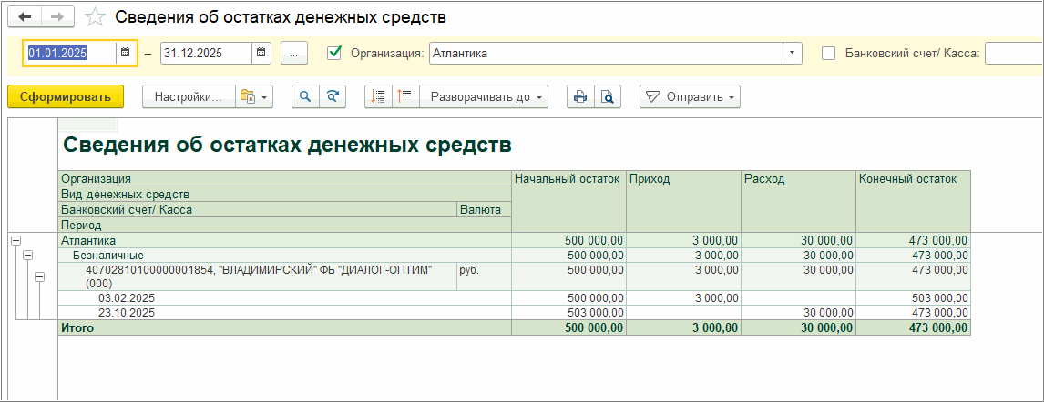 Документ «Сведения об остатках денежных средств» используется для ручного ввода начальных и конечных остатков денежных средств, а также оборотов (приход и расход). Данные вводятся в разрезе конкретных банковских счетов и касс, с указанием валюты, начального остатка, оборотов за период и конечного остатка. Таким образом формируется управленческая картина движения денежных средств, актуальная на текущий момент времени.