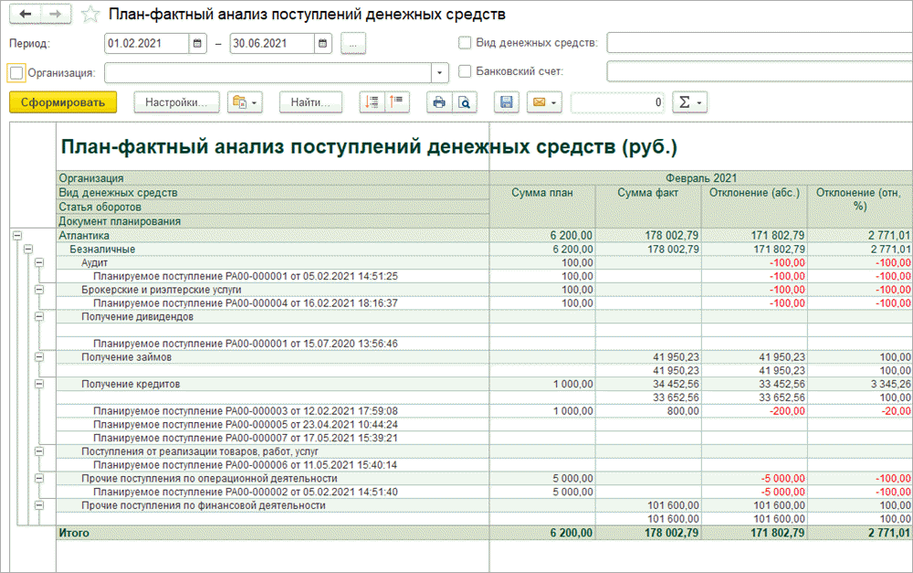 Отчет «План-фактный анализ поступлений денежных средств» используется для анализа исполнения планируемых поступлений. Он показывает, какие поступления были фактически получены, в каком объеме и какие фактические поступления не были заранее запланированы.