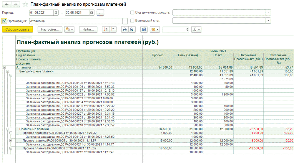 Отчет «План-фактный анализ по прогнозам платежей» позволяет оценить, насколько предварительные финансовые ожидания совпали с реальным исполнением. Финансовый директор может увидеть, какие прогнозы были реализованы через заявки, в каком объеме и где возникли отклонения, а также выявить платежи, прошедшие вне прогнозного планирования.