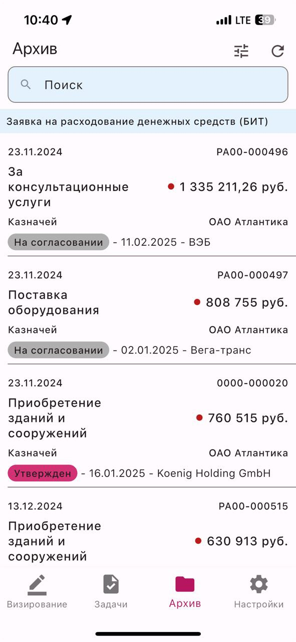 Мобильное приложение БИТ.ФИНАНС позволяет согласовывать документы и оперативно корректировать финансовую ситуацию компании вне офиса. С его помощью можно согласовывать заявки на расходование денежных средств и реестры платежей прямо с телефона, просматривать документы в реестре, их суммы и валюту, а также открывать их для ознакомления и согласования.