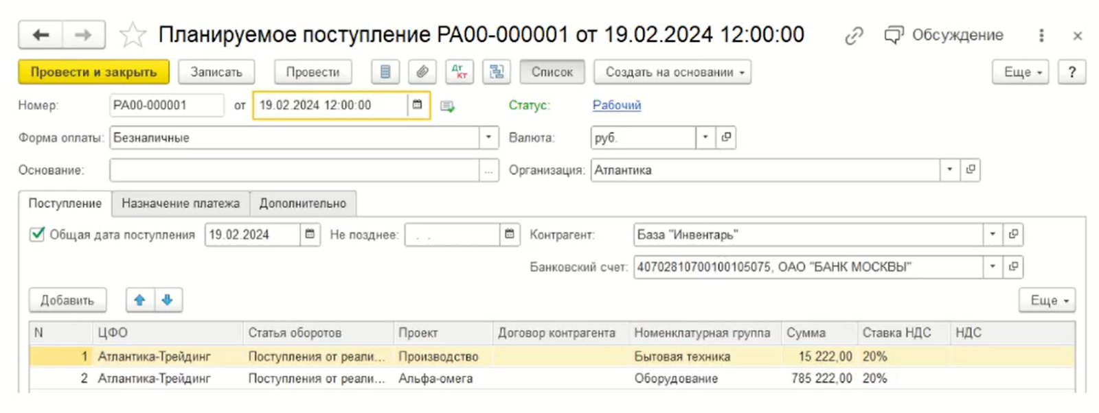 Планируемые поступления отражаются в платежном календаре и могут в дальнейшем быть связаны с фактическими операциями, что повышает точность план-фактного анализа.
