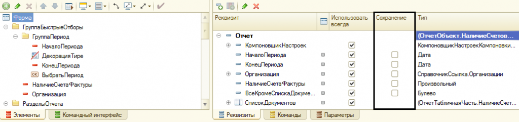 - Восстановление и сохранение в настройках. Для этого нужно зайти в список реквизитов и напротив каждого реквизита, который нужно сохранить ставим галочку в соответствующей колонке.