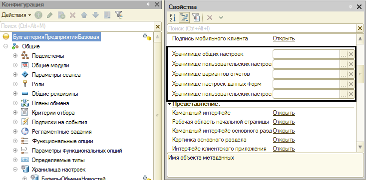 Как работает «Хранилище настроек»? Оно является объектом метаданных, который пописывает порядок хранения установленных настроек у некоторых объектов. Так, для примера мы откроем программу, «1C: Бухгалтерия», перейдем в конфигурационный режим и развернем дерево данных. Нам понадобится узел, который находится по следующему пути: