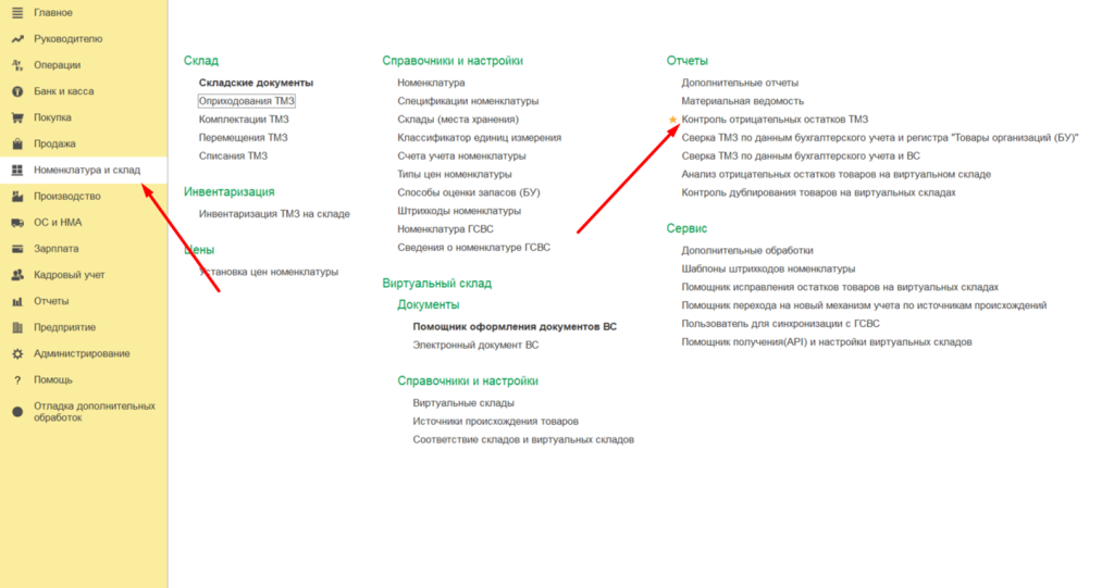 Если в программе уже включено разрешение на списание при фактическом отсутствии товаров, необходимо контролировать наличие отрицательных остатков. Это особенно актуально при закрытии отчетного периода, когда необходимо считать разные показатели для целей налоговой и управленческой отчетности. Контролировать отрицательные остатки можно, используя специальный отчет – «Контроль отрицательных остатков ТМЗ». Его можно сформировать в разделе «Номенклатура и склад», нажав на соответствующую ссылку. Откроется окно отчета следующего вида.