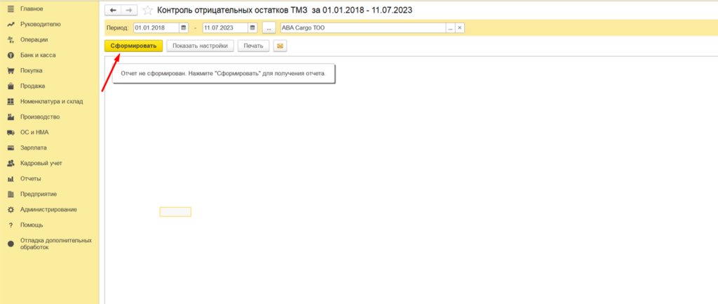 В появившемся окне нужно указать организацию и период, за который необходимо получить информацию по отрицательным остаткам. После этого нужно нажать кнопку «Сформировать». На экране появится готовый отчет по отрицательным остаткам.