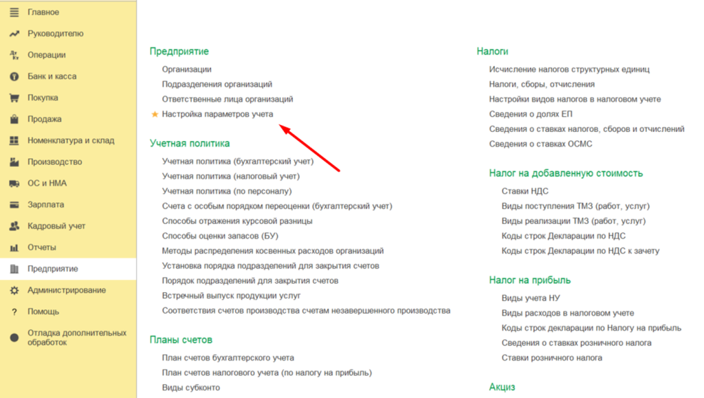 Изначально 1С настроена таким образом, что провести отгрузку отсутствующего на складе товара невозможно. Однако в программе предусмотрена специальная настройка, которая позволяет отключить запрет на подобные операции. Это можно сделать очень просто. В разделе «Предприятие», пройдя по ссылке «Настройка параметров учета», где открывается окно настройки проведения.