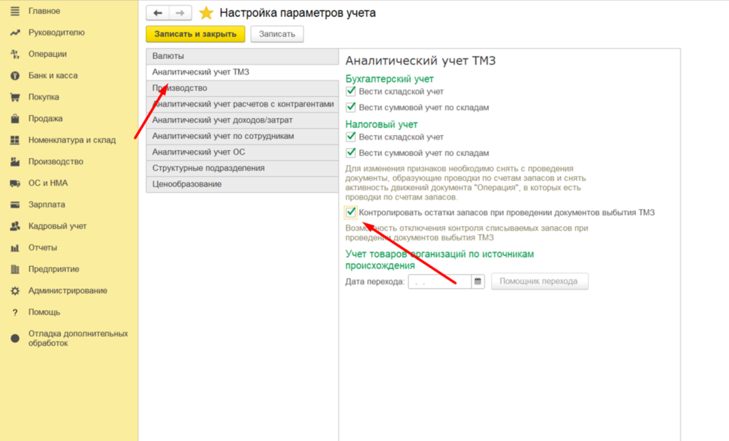 В открывшемся окне переходим в «Аналитический учет ТМЗ», где в окне установки напротив строки «Контролировать остатки запасов при проведении документов выбытия ТМЗ» нужно установить галочку. Готово. Теперь товар может быть списан даже в том случае, если он отсутствует на складе.