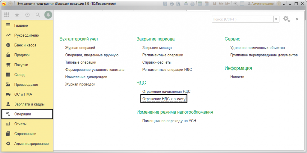 1С:Бухгалтерия предусматривает полную автоматизацию процесса учета НДС. Вместе с тем, нередко, возникает необходимость введения налога в «ручном режиме». В частности, при ведении упрощенки, или когда необходима его аннуляция, корректировка или уточнение. Именно для этого в «Операциях НДС» предусмотрена опция – «Отражение НДС к вычету». Расположение этой опции, представлено на рисунке 1.