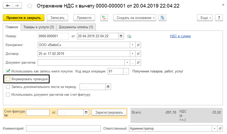 - В случае, если позиция «Использовать как запись книги покупок» не будет выбрана, то налог отразиться в позиции «к вычету», аналогично поступающим документам. В такой ситуации, чтобы книга покупок содержала соответствующую запись, необходимо дополнительное введение документа форматирования.