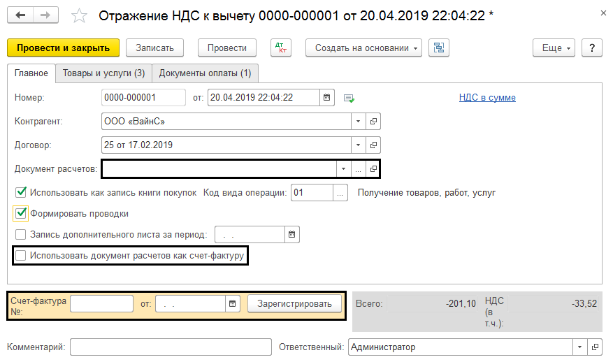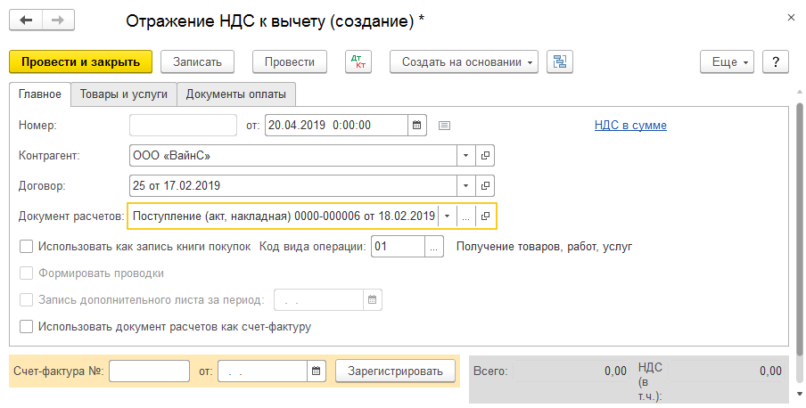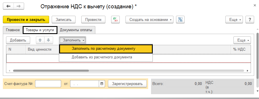 Счет-фактура вводится на основании в ходе отражения налога к вычету, например при отсутствии первичной документации поступления.