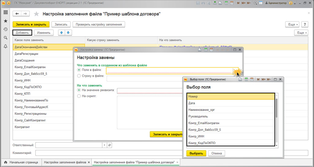 В разделе "Настройка заполнения файлов" нужно выполнить заполнение шаблона. После нажимаем на кнопку "Добавить" и выполняем настройку замены, для этого указываем введенные поля из нашего шаблона.