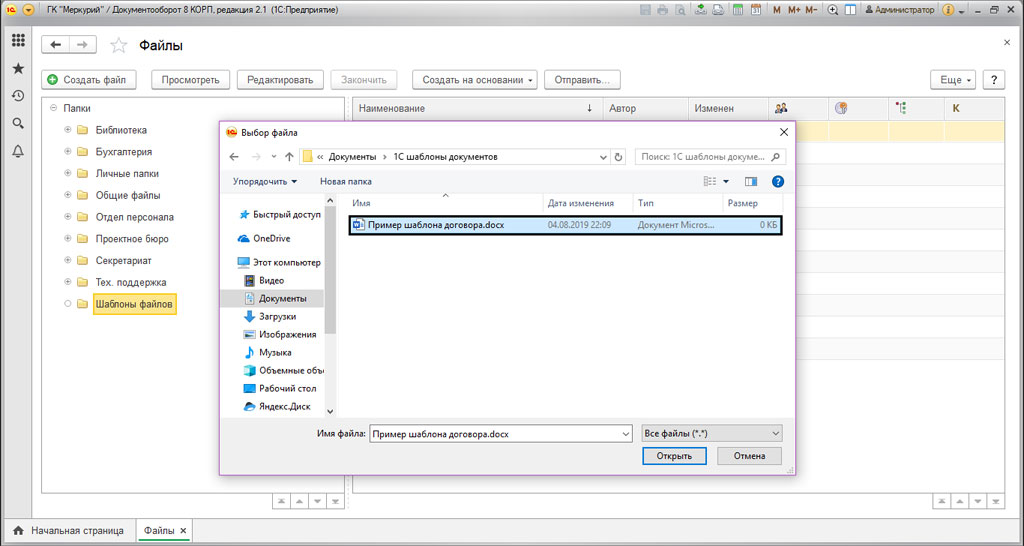 После этого, в следующем окне выбираем до этого подготовленный файл. Называем его на свое усмотрению, например, "Пример шаблона договора". В будущем в нем будет храниться наш шаблон документа.