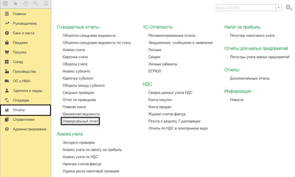 В «1С: Предприятие 8.3», много видов отчетности. Среди прочих особый интерес представляет «Универсальный отчет», который можно найти в меню «Отчеты» - «Стандартные».