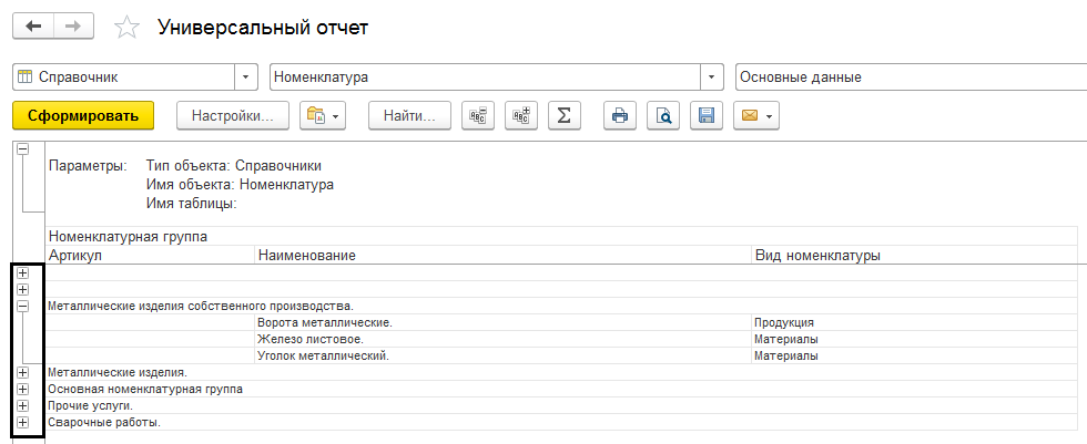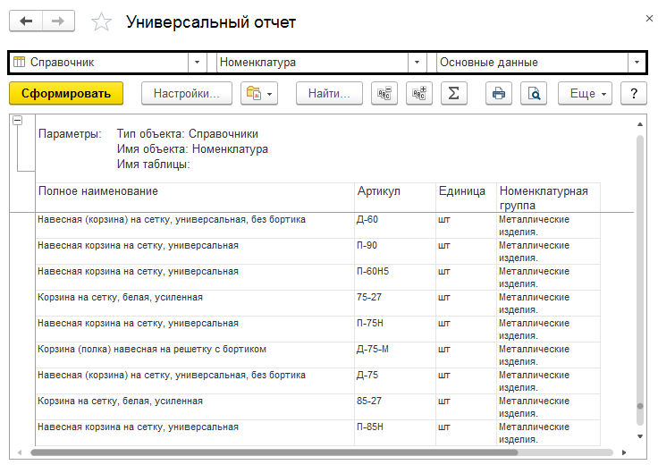 Следующим примером будет отчет построенный по данным справочников. Допустим, нам необходимо получить данные о составе номенклатурных групп. Для этого выберем элемент отчета «Справочник» - «Номенклатура» - «Основные данные», а в настройках задаем нужные поля и сортировку. Не забудем на вкладке настроек «Поля и сортировка» отметить «Номенклатурную группу». Этим способом мы сможем узнать в каких элементах номенклатурная группа установлена неверно или не установлена вообще.