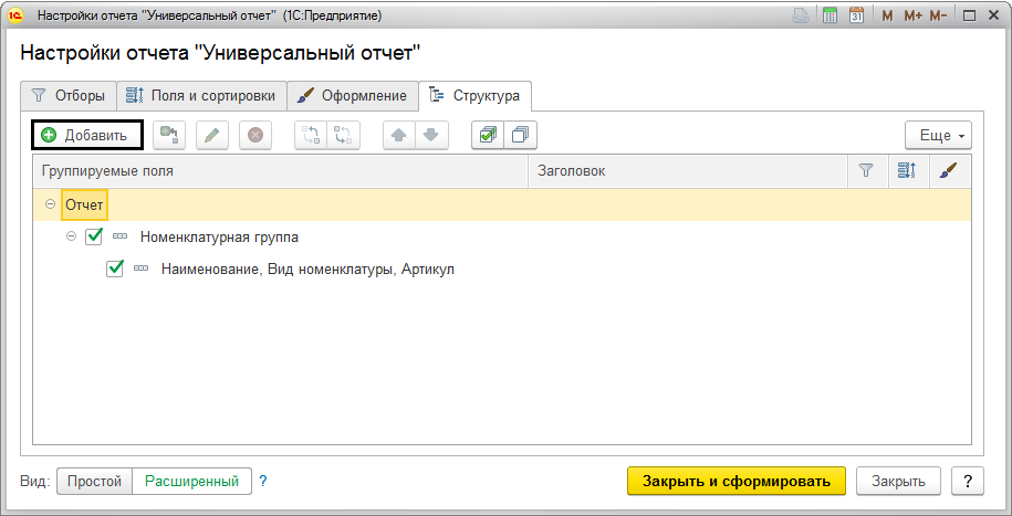Чтобы наш отчет принял более компактный вид для удобного просмотра, снова перейдем в настройки на вкладке «Структура» и добавим поля для группировки в разрезе номенклатурной группы. Таким образом первым полем у нас будет номенклатурная группа, а все данные будут разворачиваться по каждой группе.
