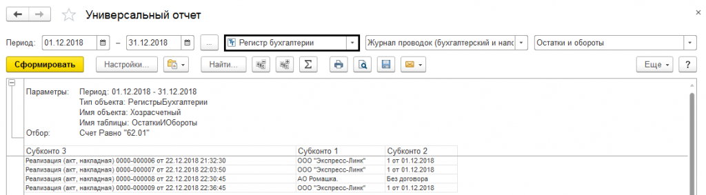Отчеты по регистрам, которые выбрали, сформируются по умолчанию и не требуют настройки. Для регистра бухгалтерии настройка выглядит следующим образом: