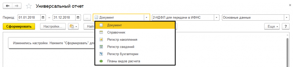 Заходим в «Отчеты» - «Стандартные» и выбираем пункт «Универсальный отчет». Кроме периода, за который требуется сформировать отчет, мы так же можем выбрать по какому объекту наш отчет будет сформирован. Это могут быть отчеты, сведения, справочники или определенный вид документа и многое другое. В зависимости от того, что выберем, будут различаться настройки отчета, но все основные настройки и принципы составления отчета остаются неизменными.