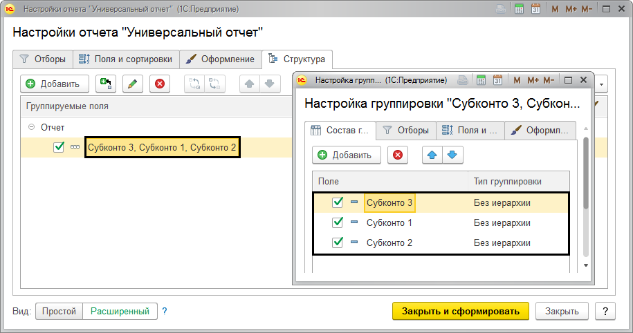 Таким образом, мы используем различные отборы для формирования нужных данных с помощью «Универсального отчета». В нашем отчете не так много информации, но при больших объёмах информации «Универсальный отчет» ещё позволяет задавать структуру отчета, для группировки данных по какому-либо признаку. Например, в отчете требуется сгруппировать данные по всем контрагентам, по месяцам. Заходим снова в настройки отчета и переходим на вкладку «Структура». На неё задаем группировку по полю «Контрагент» и дополнительную структуру данных под ней, например: Дата, Договор и Тип цен. Снова формируем отчет кнопкой нажатием на «Закрыть и сформировать».