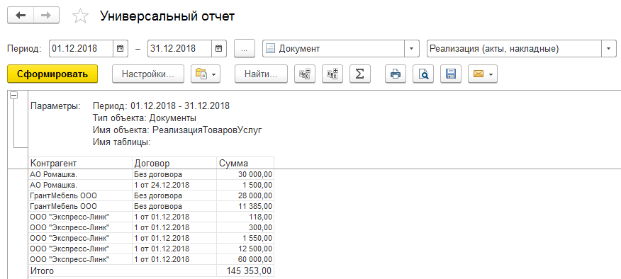 Универсальный отчет приходит на помощь, когда стандартных отчетов не хватает или требуется выбрать специфическую информацию, а готового варианта отчета подходящего для этого просто нет.