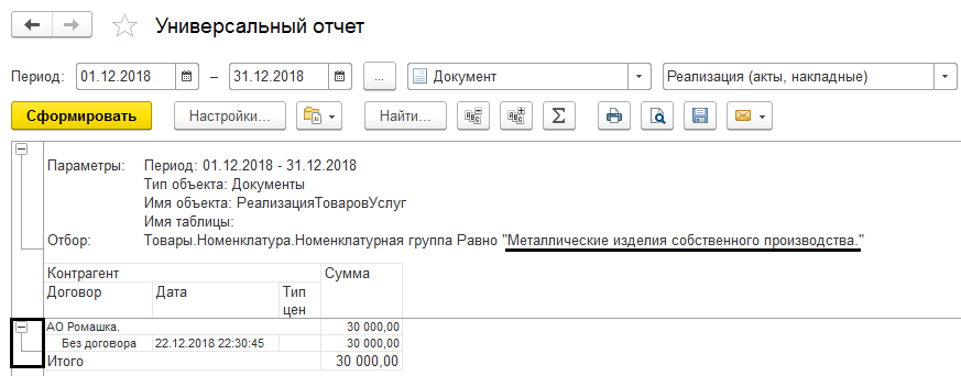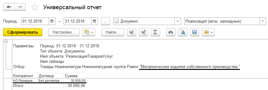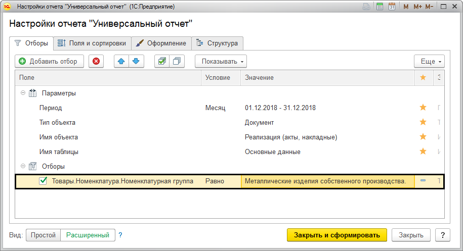 Данный отчет может напомнить один из стандартных отчетов «Оборотно-сальдовая ведомость по счету», который может отображает такую информацию. Но ключевая особенность «Универсального отчета» в его способности показывать данные, которые не найти и не сформировать в стандартных отчетах 1С:Предприятие. Например, если необходимо отобрать лишь данные по конкретной номенклатурной группе «Металлические изделия собственного производства», из всего объёма реализованной продукции. Чтобы это реализовать, необходимо нажать на кнопку «Настройки...» и на закладке «Отборы», воспользовавшись кнопкой «Добавить отбор», сделаем «Товары.Номенклатура.Номенклатурная группа» по условию равным «Металлические изделия собственного производства». Чтобы применить настройки нажимаем «Закрыть и сформировать».